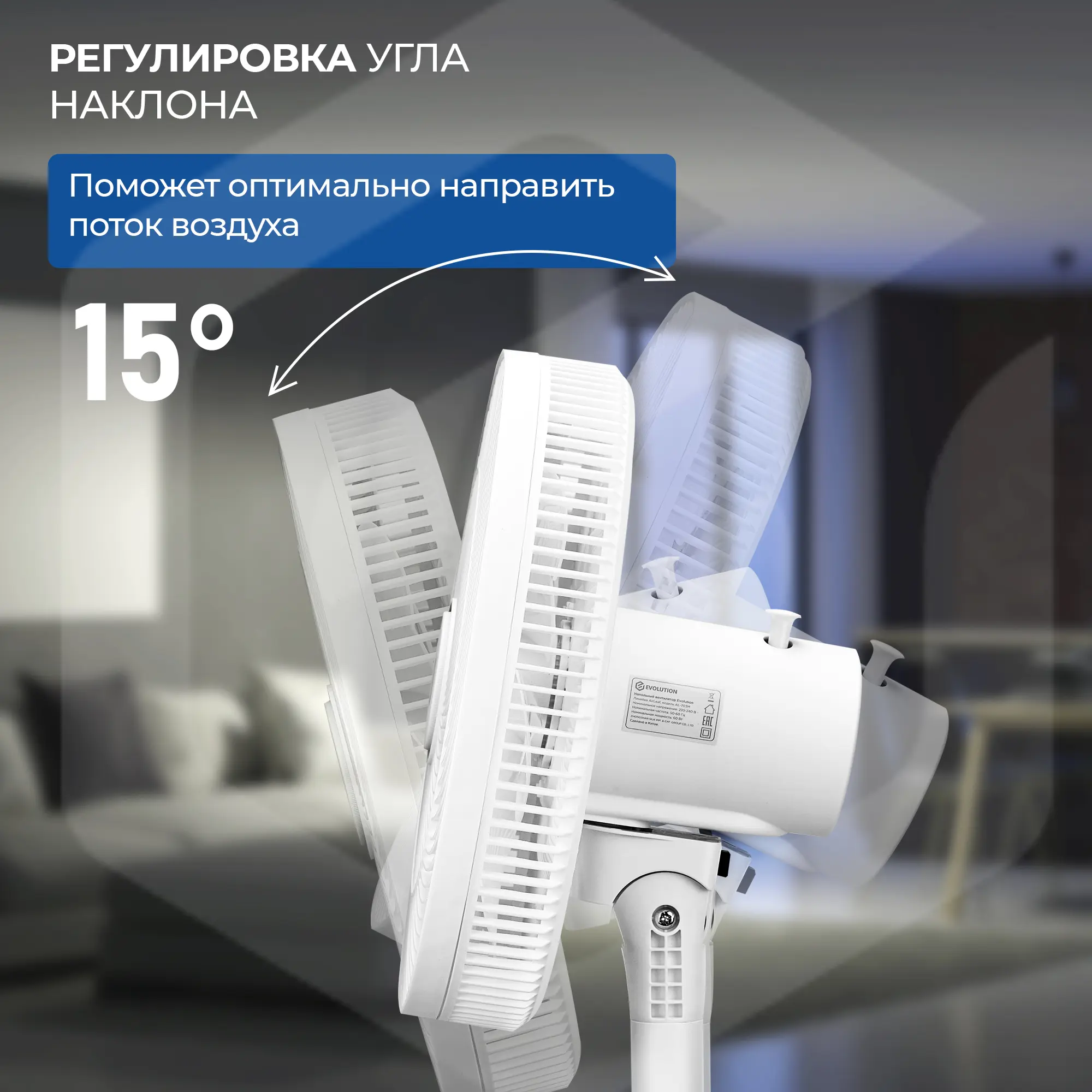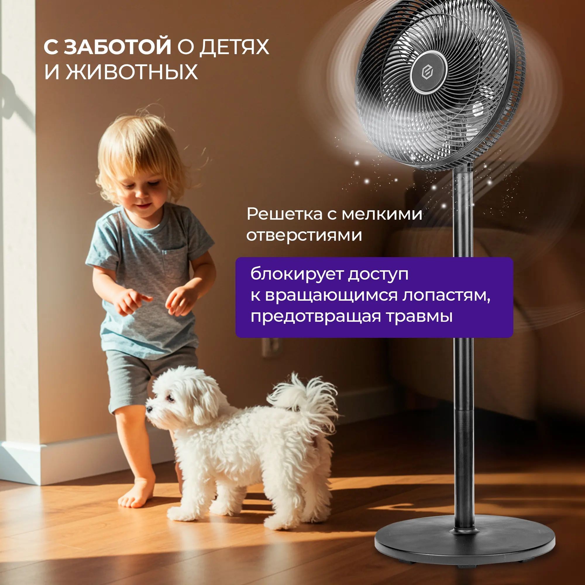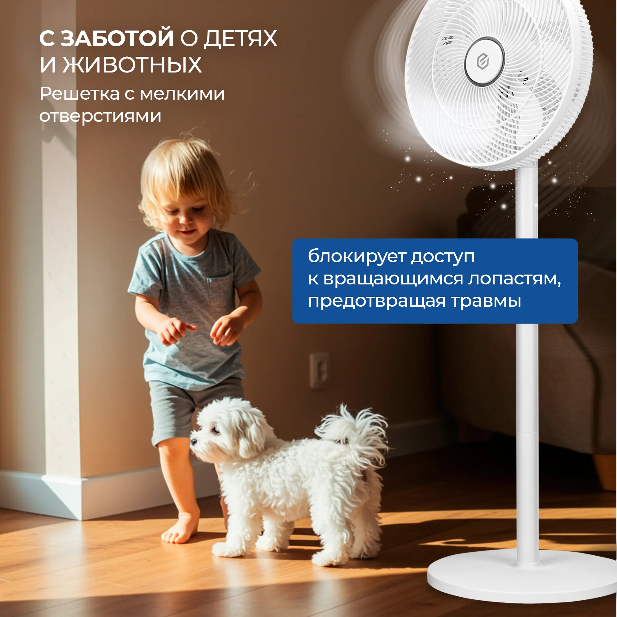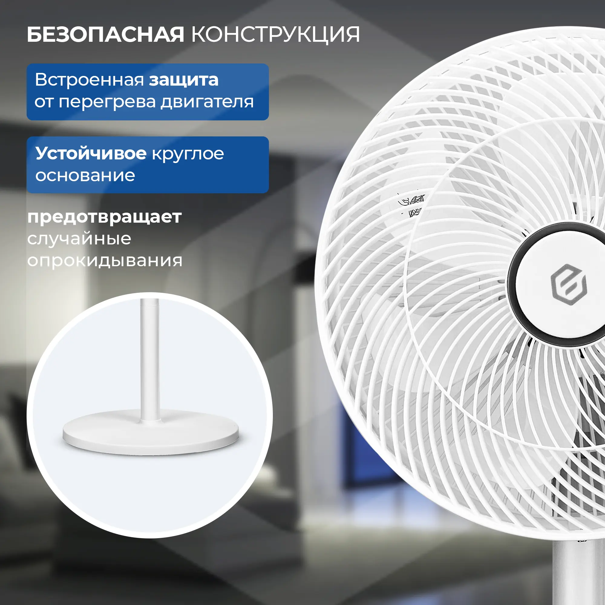 - В конструкции предусмотрены особые меры для обеспечения безопасной работы: благодаря утяжеленной круглой основе опрокидывание белого напольного вентилятора исключено. Ребра жесткости на защитной решетке исключают ее деформацию при механических воздействиях, предохраняют лопасти от попадания посторонних предметов. Прибором безопасно пользоваться в помещениях, где живут дети и животные.