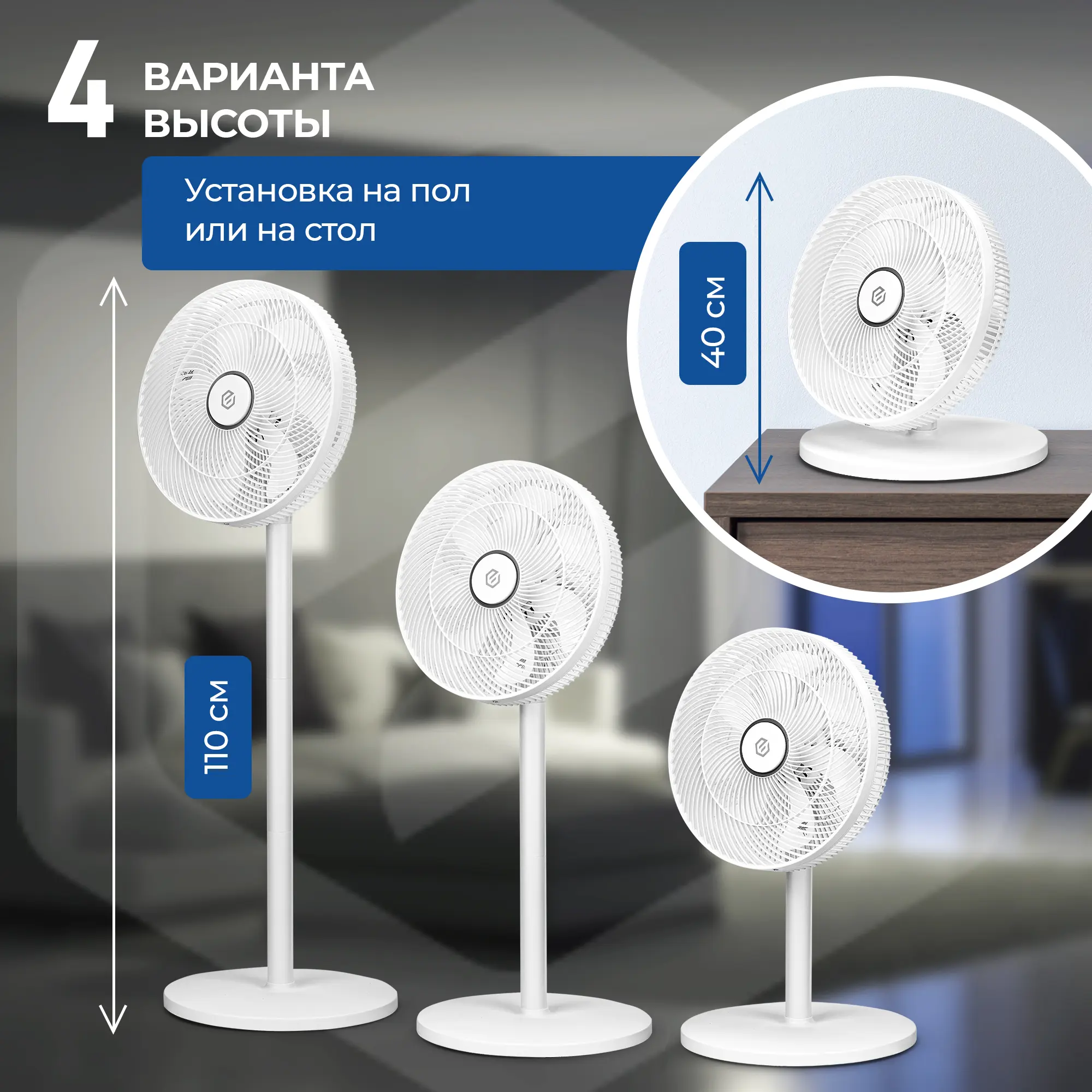 Конструкция лаконична и продумана до мелочей: всего парой движений можно изменить высоту штанги от 110 до 40 см (есть 4 варианта регулировки) и из напольного варианта сделать настольный и наоборот. Съемная решетка обеспечивает возможность быстро демонтировать ее, чтобы удалить загрязнения. Угол поворота можно менять в пределах 90°, а также регулировать наклон вниз и вверх. Благодаря вращающейся конструкции увеличивается площадь обслуживания, улучшается циркуляция воздушных потоков в пределах комнаты.