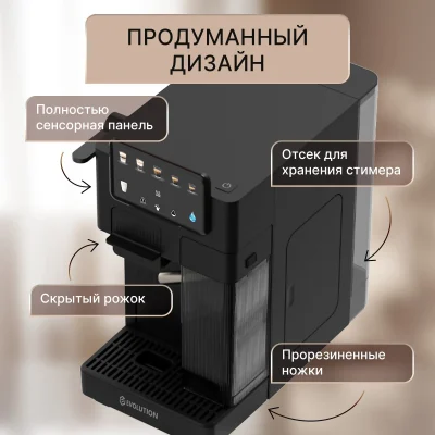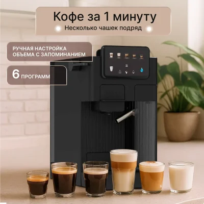- Интеллектуальное управление: Мгновенная готовность благодаря современному термоблоку. Интуитивная сенсорная панель с предустановленными программами (эспрессо, лунго, капучино, латте и др.) и функцией индивидуальной настройки объема.