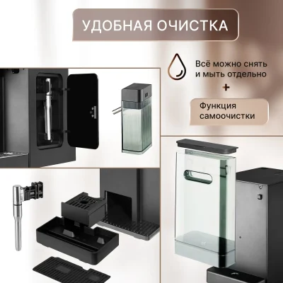 - Продуманный уход: Резервуар для воды 1,6 л и молочный контейнер из ВРA-free пластика. Простота очистки (съемные детали, программа самоочистки) и автоматические системы предупреждения для долгого срока службы.