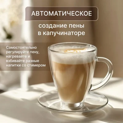 - Двойная молочная система: Готовьте идеальный капучино/латте одним нажатием (автоматический резервуар на 350 мл) или используйте стимер для латте-арта.